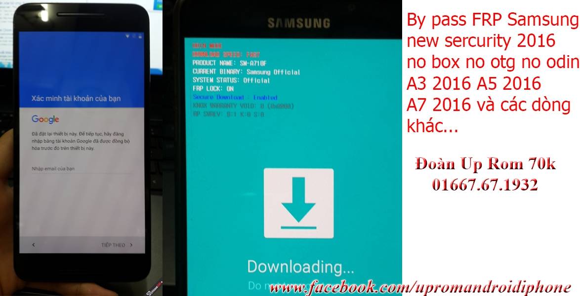 + Nhận by pass gỡ bỏ xóa remove frp lock Verify your Google Account xác minh tài khoản google của bạn trên các dòng Samsung new sercurity 2016 như A3 2016 A310 A5 2016 A510 A7 2016 A710 các samsung cập nhật phiên bản phần mềm PAx trở lên.... mà ko thể phá bằng odin, hay box hay cáp OTG được. Nhận Xóa xác thực account google ( Verify your account ) Samsung Galaxy A3 2016 A5 2016 A7 2016 A710F A710FD Fix lỗi Samsung Galaxy A3 2016 A5 2016 A7 2016 A710F A710FD bị lock tài khoản google khi hardreset hay up rom Nhận tắt kích hoạt FAP LOCK ON cho A3 2016 A5 2016 A7 2016 A710F A710FD chạy Anndroid 5.1.1 Bypass google account A3 2016 A5 2016 A7 2016 A710F A710FD tại Hà Nội Khi các bạn khởi động Samsung và nhận ngay thông báo: Custom binary blocked by FRP SECURE FAIL: KERNEL - Sau khi xử lý quý khách nâng cấp phần mềm, up rom thoải mái, khôi phục mặc định (hard reset) thoải mái không lo bị khóa - Ngoài các dòng máy kể trên chúng tôi nhận Gỡ tài khoản/ Xóa tài khoản/ Xác thực tài khoản Google Account cho tất cả các máy Samsung Galaxy các dòng như Samsung S6, S6 edge, Galaxy A8, Galaxy J7, Galaxy J5, Grand Prime G531H, Note 5, S6 edge+,... các máy dòng LG G4, Nexus 6,.... Liên hệ: Đoàn Up Rom 70k - 01667.67.1932 (Call, SMS, Viber, Zalo) Skype: doanuprom Facebook: https://www.facebook.com/upromandroidiphone
