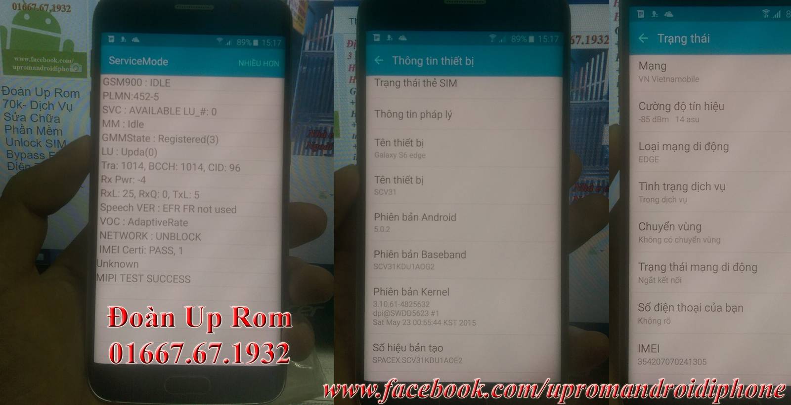 Dịch vụ phá password, xóa mật khẩu không mất dữ liệu cho các dòng máy android, unlock sim s7 tmobile Điện thoại smart phone chúng ta đặt mật khẩu để bảo mật nhưng đôi khi không máy chúng ta quên mất password không nhớ hay do nghịch ngợm vô tình đặt password rồi quên pass. Trong máy lại có nhiều dữ liệu quan trọng bạn muốn dữ lại như: Tin nhắn sms, danh bạ, hình ảnh, video, nội dung zalo, viber, dữ liệu của các ứng dụng đã cài đặt... Nếu phá mật khẩu theo phương pháp thông thường thì tất cả nội dung sẽ bị xóa sạch sẽ giống như chiếc máy mới mua. Để đáp ứng nhu cầu phá mật khẩu mà dữ lại dữ liệu bên trong bên e sử dụng các box phần mềm các thiết bị chuyên dụng để làm việc này. Các dòng máy chạy android có khả năng cao phá được password bao gồm: Samsung, LG, HTC, Các dòng máy android chạy chip mtk meditek (rất nhiều dòng máy chạy chip như lenovo, oppo, mobiistar, qmobile, huawei, đặc biệt là các máy android trung quốc hay fake samsung thì chủ yếu dùng con chip này)... Nói chung không phải tất cả các máy đều có thể phá được password mà giữ lại được dữ liệu data cũ nhưng số lượng máy làm được là rất nhiều nên khi quý khách có nhu cầu thì cứ liên hệ với bên e. Bên e sẽ báo lại có làm được không và giá làm là bao nhiêu. Liên hệ: Đoàn Up Rom 70k - 01667.67.1932 (Call, SMS, Viber, Zalo) Skype: doanuprom Facebook: https://www.facebook.com/upromandroidiphone Samsung Galaxy S7 SM-G930T S7 EDGE SM-G935T Tmobile SM-G935T unlock sim mở mạng cài tiếng việt thành công. Samsung S7 SM-G930T và S7E SM-G935T Tmobile hiện chưa có box nào có thể unlock được nên phải unlock bằng hình thức mua code làm server. Sau khi unlock xong đã root và cài tiếng việt ok. Unlock sim này là vĩnh viễn quý khách hoàn toàn có thể khôi phục cài đặt gốc cài đặt các bản rom khác nhau hay mang máy ra nước ngoài vẫn nhận sim bình thường. Giá mua code có thay đổi theo thời điểm khác nhau nên liên hệ trực tiếp số điện thoại để có giá tốt nhất. Nhận fix lỗi không lưu pass wifi không lưu mật khẩu wifi mỗi lần bật tắt wifi hay khởi động lại máy trên các dòng Samsung Galaxy S7 SM-G930T S7 EDGE SM-G935T Tmobile SM-G935T Nhận bypass FRP Lock, xóa xác minh tài khoản google của bạn cho Samsung Galaxy S7 SM-G930T S7 EDGE SM-G935T Tmobile SM-G935T và tất cả các dòng android khác kể cả máy tàu không có tên tuổi Ngoài ra bên e còn nhận unlock sim cho tất cả các dòng điện thoại chạy android mang từ nước ngoài về khác quý khách có nhu cầu cứ liên hệ với bên em nhé. Một vài hình ảnh của máy: Fix lỗi sửa lỗi LG G3 Veziron Sprint Vs985 Ls990 chỉ lên 2g gsm only (chữ E, G, GSM) không lên được 3g wcdma only. Bật chế độ chỉ 3g là mất sóng. Bên e xử lý hoàn toàn bằng box làm phần mềm chuyên dụng ko cần tháo máy động chạm phần cứng. Giá fix lỗi 3g: 150k