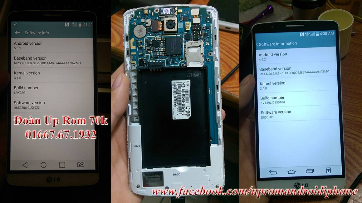 Dịch vụ up rom chạy lại phần mềm root máy fix lỗi tin nhắn app hàn cho LG Optimus G3 Beat F470L/S/K SphinX G3 cho G3 Beat F470L/S/K xách tay hàn quốc - Thay đổi nền ROM G3 F470 ổn định cao nhất - Fix mọi vấn đề nhà mạng Hàn Quốc: Bàn phím, call to local, chia thread SMS. - Xóa bỏ app Hàn. - Nâng cấp các app và Google App mới nhất - Bổ sung các app hữu dụng: rebooter, labankey. - Bổ sung các app shortcut: LGVideos, LGBackup, LGVideos - Thay đổi nhạc chuông tiếng Hàn thành tiếng Anh - Fix lỗi copy dữ liệu từ bộ nhớ trong qua thẻ nhớ - Thay thế logo khởi động từ bản quốc tế. - LGSmartworld quốc tế. Phone: - Dọn dẹp sạch sẽ Cài đặt cuộc gọi, quy hoạch gọn gàng - Có đầy đủ các chức năng. - Ghi âm cuộc gọi. Contact: - Fix bàn phím tiếng Hàn - Fix Hidden Code (*#*#4636#*#*) Tin nhắn: - Fix chia thread tin nhắn LockScreen: - Bổ sung thêm 8 Hiệu ứng màn hình khóa (tổng cộng có 12 hiệu ứng) - Xóa bỏ đồng hồ đôi. Liên hệ up rom: Đoàn Up Rom 70k - 01667.67.1932 (Call, SMS, Viber, Zalo) https://www.facebook.com/upromandroidiphone