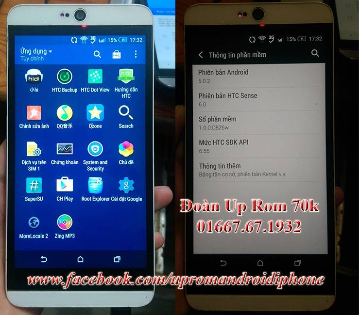 - Dịch vụ Up rom chạy tiếng việt cài CH Google Play Store cửa hàng down ứng dụng đồng bộ danh bạ cho HTC Desire 826 826W tất cả các phiên bản ( A52_DTUL, A52_TUHL, A52_DWGL). - Đoàn up rom nhận s-off supercid up rom stock cứu máy HTC Desire 826 bị treo logo up rom lỗi, đang s-on ko up rom gốc được, Unlock bootloader - Root - Custom Recovery - Flash Rom cho HTC 826. - Nhận nâng cấp android 5.0.2 sense 6 lollipop không bị lỗi wifi cho HTC Desire 816 (A5_UL A5_DUG A5_THUL..), fix htc HTC Desire 816 A5 nâng cấp rom bị lỗi wifi treo logo tại hà nội. Up rom quốc tế cài tiếng việt fix lỗi đơ cảm ứng nhận cảm ứng chậm cài CH Google play store cho HTC Desire 816 A5, S-OFF supercid HTC Desire 816 A5 để up rom thoải mái - Nhận up rom chạy lại phần mềm phá by pass google account verification, xác minh tài khoản google của bạn cho Các dòng Samsung galaxy A3, A5, A7, A8, A9 (Phá được cả phiên bản 2016 vừa mới ra mắt ạ) - Up Rom stock tiếng Việt, CH Play cho Note 5 N9200 hai SIM - Rom full N9200 HK - Up rom cứu treo logo root cài tiếng việt cho Samsung Galaxy i337 ATT - Nhận fix lỗi diệt virus quảng cáo tự động cài phần mềm khi bật wifi 3g cho tất cả các dòng android, nhận s-off supercid cho tất cả các dòng HTC chạy android... Giá dịch vụ: Root 50k Up rom 70k, Cứu treo logo unbirck cứu boot: 100k - 200k Liên Hệ dịch vụ: Đoàn Up Rom 70k - 01667.67.1932 Facebook: https://www.facebook.com/upromandroidiphone