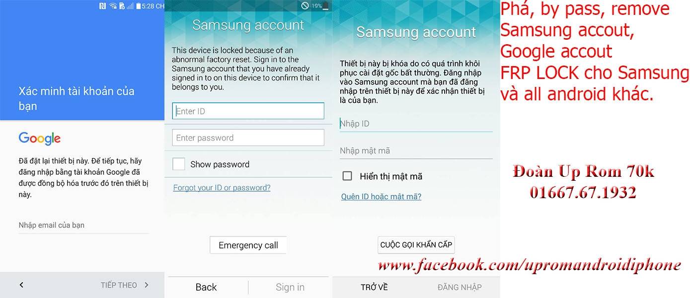 Nhận xóa Google Account, gỡ bỏ Google Account, thoát Google Account, mở khóa Google Account và Samsung Account, Reset FRP Lock, bypass FRP Samsung, LG, HTC,...và all android khác - Máy bị khóa tài khoản samsung, xác minh tài khoản google sau khi Factory reset ( Hard reset ) hoặc up rom stock nên không vào trong được ần tương tự như icloud trên iphone. - Kiểm tra trong Download Mode dòng Reactivation Lock: ON và FAP Lock : ON -Không thể cài rom, recovery, up rom qua odin báo failed đỏ - Hiện tại SAMSUNG có 2 chế độ khóa tài khoản là Reactivation Lock ( Samsung Account ) và FAP Lock ( Google Account ) - Gỡ tài khoản/ Xóa tài khoản Google Account cho tất cả các máy Samsung bị dính tài khoản lấy ngay - Xác thực tài khoản Google Account cho tất cả các máy Samsung Galaxy yêu cầu xác thực tài khoản Google lấy ngay - Không tháo máy, quý khách ngồi chờ xem và lấy ngay - Sau khi xử lý quý khách nâng cấp phần mềm, up rom thoải mái, khôi phục mặc định (hard reset) thoải mái không lo bị khóa - Những model máy sau đây khi up rom stock hoặc factory reset sẽ bắt nhập tài khoản nếu không thoát ra Samsung Galaxy Note 3 xóa acc samsung ok + N900 khóa tài khoản samsung ( Reactivation Lock ) + N9005, N900A, N900T, N900V khóa tài khoản samsung ( Reactivation Lock ) + N900L/S/K khóa tài khoản samsung ( Reactivation Lock ) Samsung Galaxy Note 4 xóa acc samsung ok + N910A khóa tài khoản samsung ( Reactivation Lock ) + N910V khóa tài khoản samsung ( Reactivation Lock ) + N910U, N910C, N910L/S/K khóa tài khoản samsung ( Reactivation Lock ) Samsung Galaxy S5 xóa acc samsung ok + G900A khóa tài khoản samsung ( Reactivation Lock ) + G900H khóa tài khoản samsung ( Reactivation Lock ) Samsung Galaxy S6 & S6 Edge xóa acc samsung & xác minh google account ok + G920F Android 5.0.2 & 5.1.1 khóa tài khoản samsung ( Reactivation Lock ) + G925F Android 5.0.2 & 5.1.1 khóa tài khoản samsung ( Reactivation Lock ) + G920P Android 5.1.1 khóa xác mình tài khoản tài khoản Google ( FAP Lock ) + G925P Android 5.1.1 khóa xác mình tài khoản tài khoản Google ( FAP Lock ) + G920T Android 5.1.1 khóa xác mình tài khoản tài khoản Google ( FAP Lock ) + G925T Android 5.1.1 khóa xác mình tài khoản tài khoản Google ( FAP Lock ) + G920V Android 5.0.2 & 5.1.1 khóa tài khoản samsung ( Reactivation Lock ) + G925V Android 5.0.2 & 5.1.1 khóa tài khoản samsung ( Reactivation Lock ) Samsung Galaxy Grand Prime Sm-G531H Android 5.1.1 khóa xác mình tài khoản tài khoản Google ( FAP Lock ) Samsung Galaxy A8 A800F A800FU A800Y A800M A800H A800G A800S Android 5.1.1 khóa xác mình tài khoản tài khoản Google ( FAP Lock ) Samsung Galaxy J7 J700H J700F J700S J700M Android 5.1.1 khóa xác mình tài khoản tài khoản Google ( FAP Lock ) Samsung Galaxy J5 J500H J500F J500S J500M Android 5.1.1 khóa xác mình tài khoản tài khoản Google ( FAP Lock ) Sau khi fix kiểm tra trong Download Mode dòng Reactivation Lock: OFF và FAP Lock : OFF Liên hệ up rom: Đoàn Up Rom 70k - 01667.67.1932 (Call, SMS, Viber, Zalo) Skype: doanuprom Facebook: https://www.facebook.com/upromandroidiphone