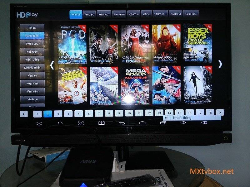Hình ảnh Android TV Box M8S trên TV khi mở giao diện chính và 200 kênh truyền hình miễn phí, các kho phim HDplay, HDviet, . . .