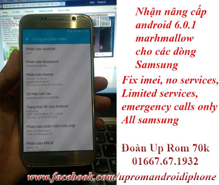 + Đoàn Up Rom nhận nâng cấp android 6.0.1 Marshmallow cho các dòng samsung. Thời điểm hiện tại 27/02/2016 đã có dòng galaxy s6 G920, S6 EDGE G925 và Note 5 N920 lên được android 6.0.1. Cảm nhận về rom 6.0.1 trên các dòng samsung: Phần thông tin liệt kế một danh sách dài nhiều tính năng mới: - Giao diện người dùng TouchWiz Home thiết kế mới - Quick connect giúp bạn tìm kiếm và kết nối các thiết bị một cách dễ dàng - Tăng cường bảo mật và tốc độ quét vân tay - Cập nhật nhật các bản vá bảo mật - Sửa lỗi quản lý RAM, đa nhiệm - ...và nhiều nhiều tính năng khác! Video: + Fix các dòng Samsung s6, s6 edge, note 5, s6 edge plus up sai rom up nhầm rom bị treo logo, bootloop, dm-verity failed, Device does not have DRK, Please install DRK first..." hoặc "Need to check DRK first... không khởi động được vào trong máy. + Nhận unlock sim fix, mở mạng cho Samsung Galaxy s5 hai 2 sim G900FD, cài tiếng việt cho S5 2 sim G9008v, G900FD... + Nâng cấp android 5.1.1 Lollipop cho Samsung Galaxy E7 E700H Liên hệ up rom: Đoàn Up Rom 70k - 01667.67.1932 (Call, SMS, Viber, Zalo) Skype: doanuprom Facebook: https://www.facebook.com/upromandroidiphone