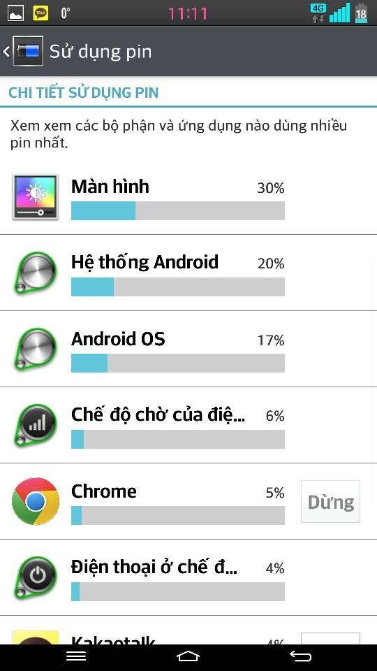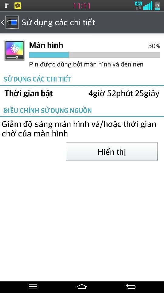 Mình thì wifi mở liên tục, xem phim online khoảng 2 tiếng, chơi audition 1 tiếng, còn lướt web được 1 tiếng, tổng oncreen khoảng 4h, 30% độ sáng màn hình.